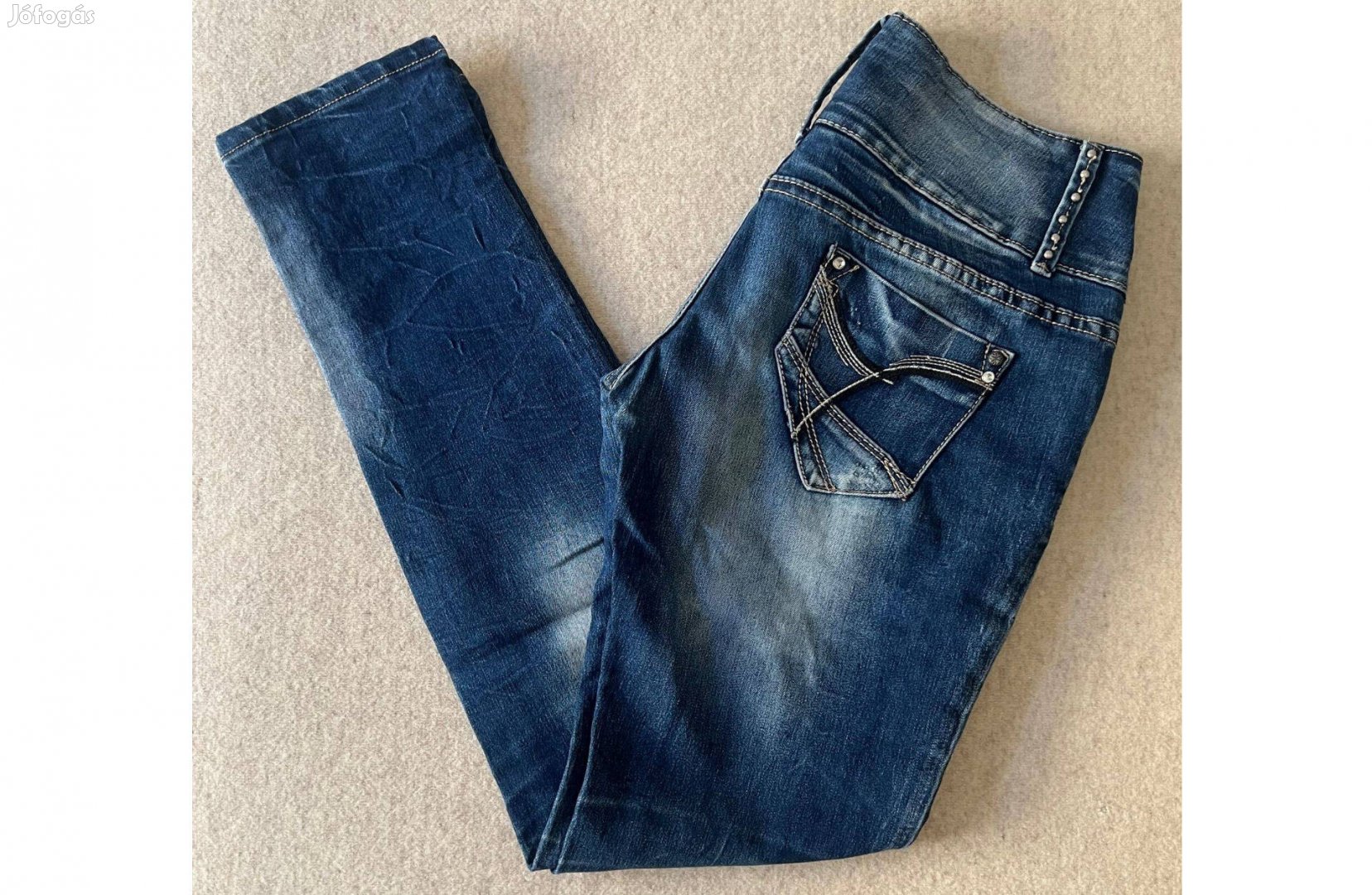 Kiváló állapotban lévő újszerű farmer nadrág eladó. Farmer fazonú, 5 zsebes, széles derekú 3 gombbal és cipzárral záródó, szűkített szárú, enyhén szaggatott női hosszúnadrág.