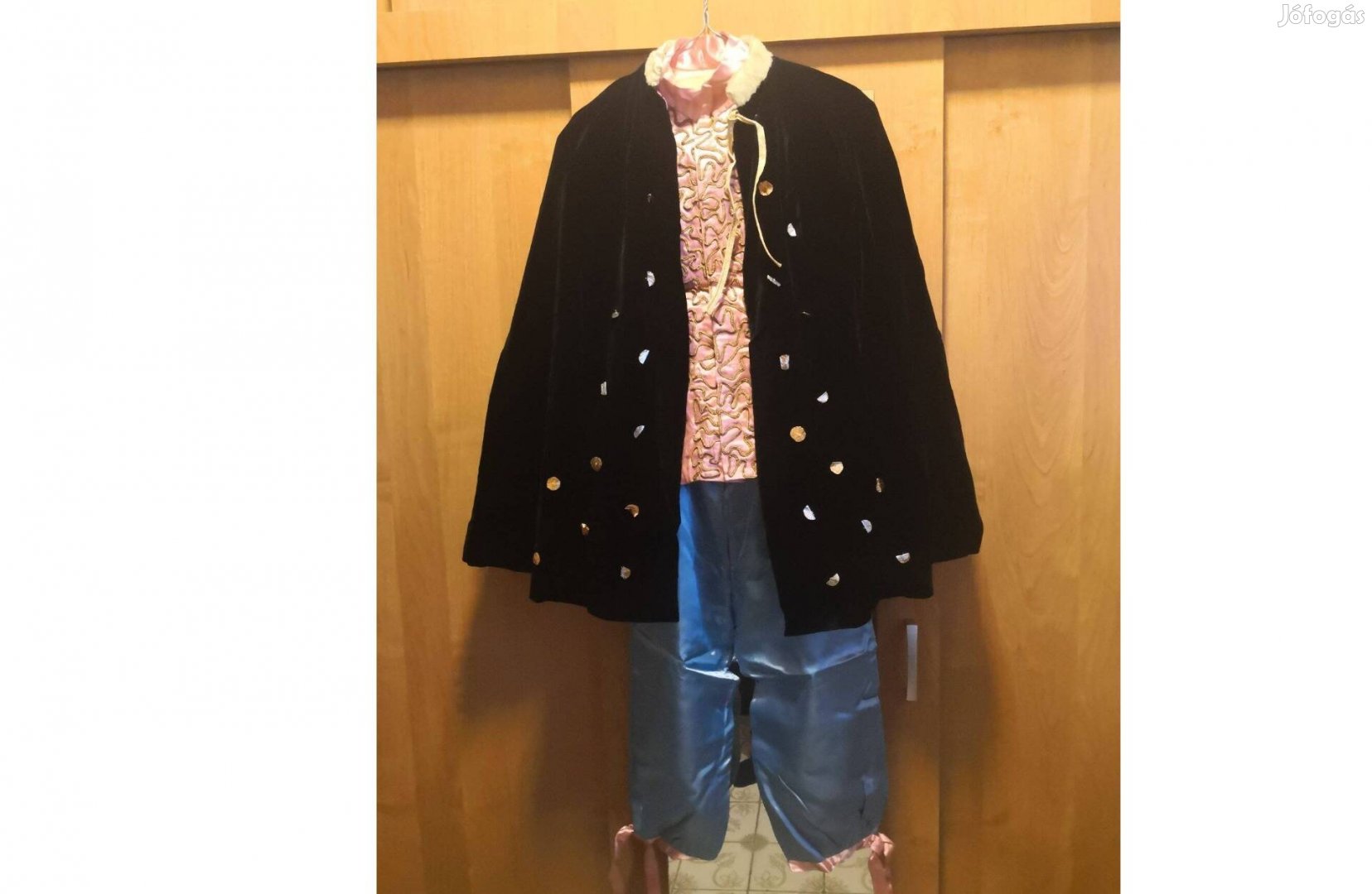 A jelmez egyedi készítésű. Selyem felső "arany sújtással", selyem nadrág. A palást fekete bársony, fehér prémgallérral.