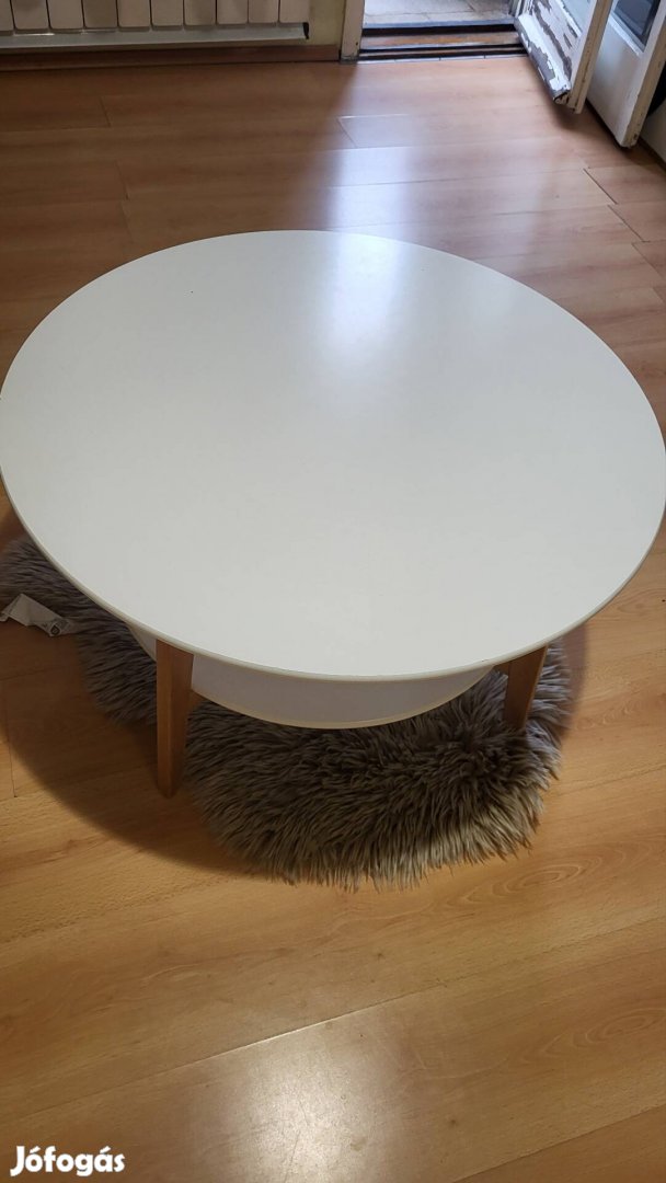 Eladó Jyskből vásárolt fehér kör alakú asztalka szőnyeggel. Apró hibái vannak, amit fotóztam. A méretei a képek között. A szőnyeg hibátlan állapotú, szintén Jysk.