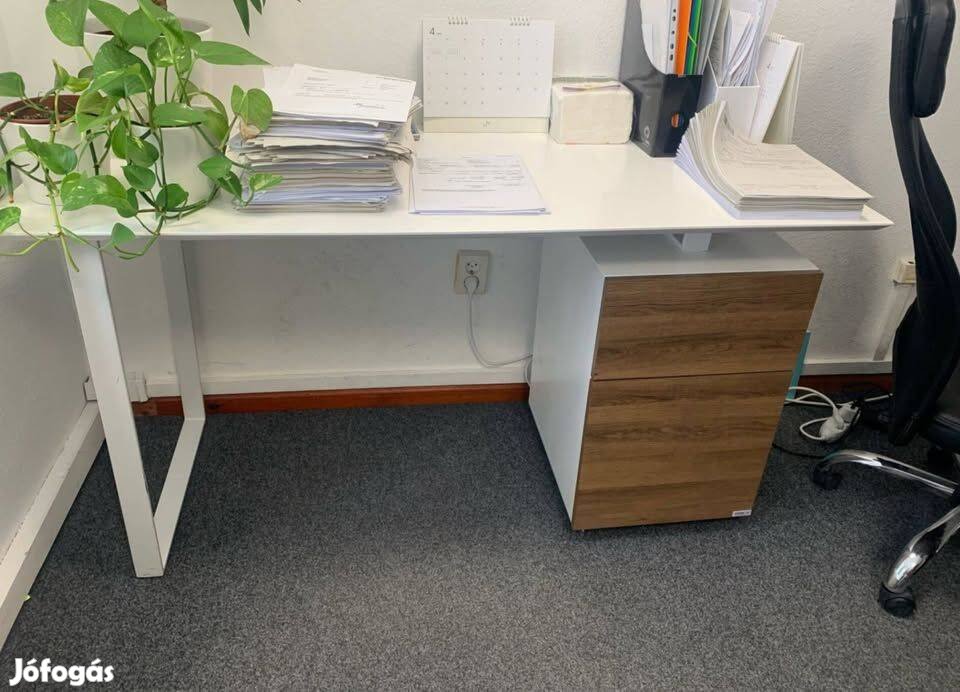 Eladó stílusos, homogén kivitelű fehér íróasztal fa hatású fiókkal, stabil fém lábakkal.