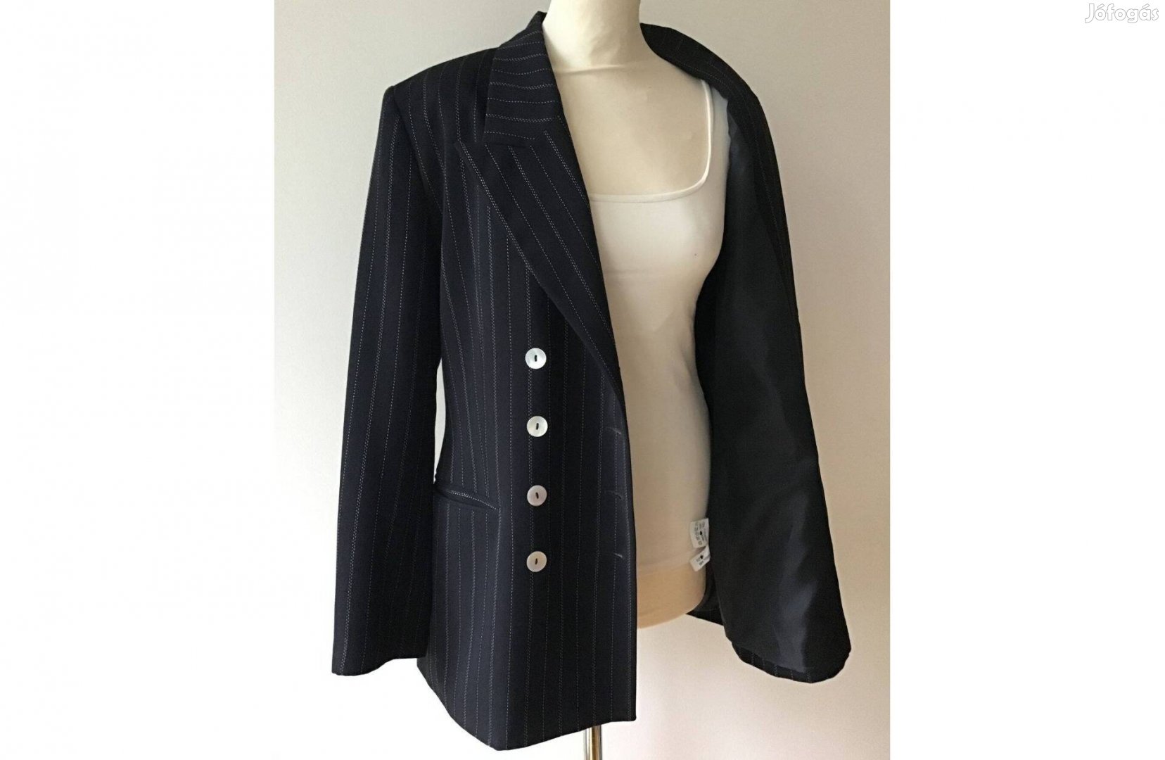 Fekete, hajszálcsíkos, gyöngyház gombos, szép blézer 40-es méret.