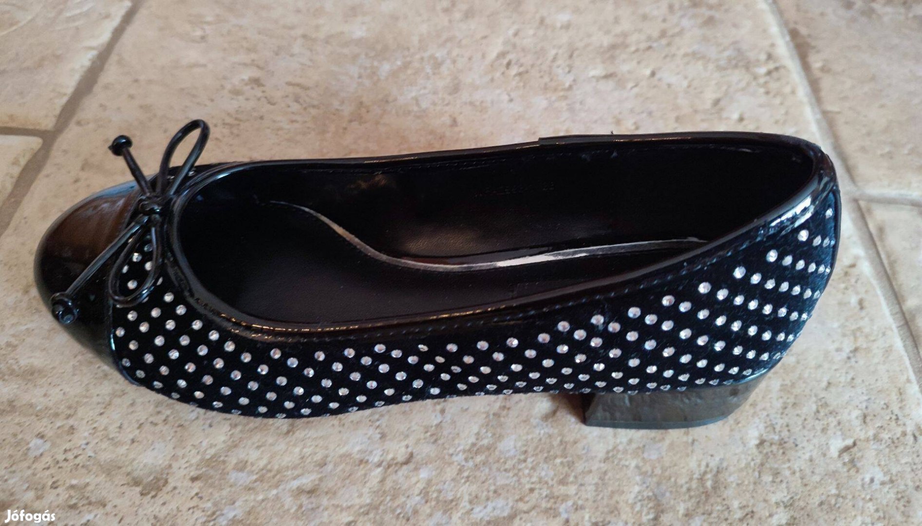 Új, sosem viselt, Nine West márkájú, fekete színű, lakkozott női körömcipő. 36-os méretű. Divatos strasszok díszítik. Sarok magassága 3,5 cm.