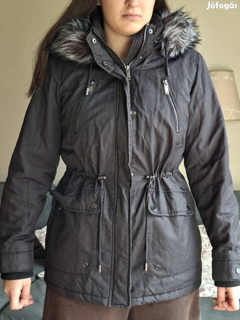 Keveset hordott fekete női télikabát felül kellemesen szőrmés betéttel eladó.