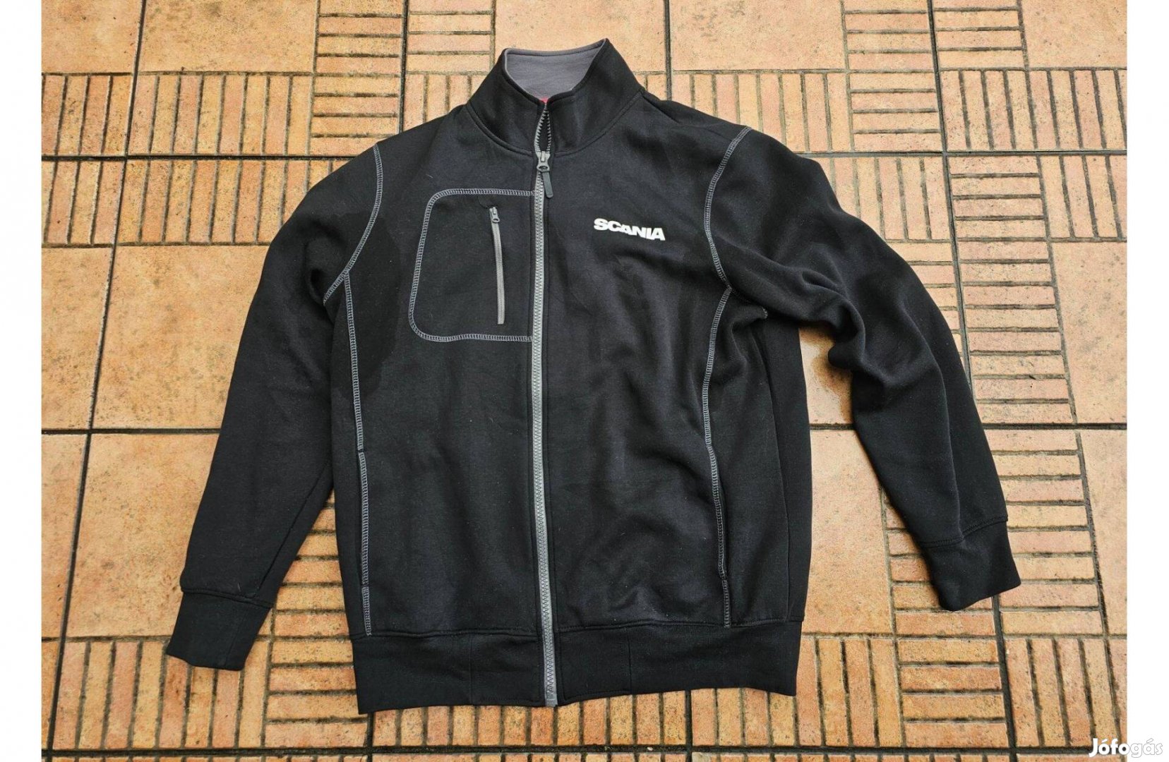 Eladó egy eredeti Fristads végig cipzáros,gumírozott ujjvégű és derekú,Scania feliratos munkás pulóver beleírt L-es