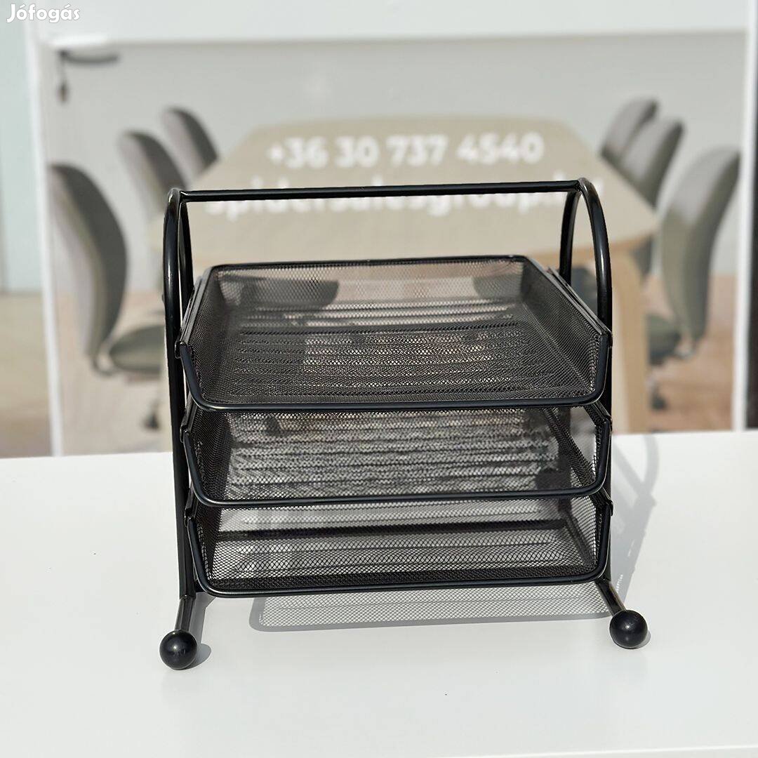 Használt, de kiváló minőségű fekete irattartó tálca eladó budafoki raktárunkból. Praktikus és tartós megoldás iratok, dokumentumok rendszerezésére az irodában. A letisztult dizájn és masszív felépítés biztosítja a hosszú távú használatot.