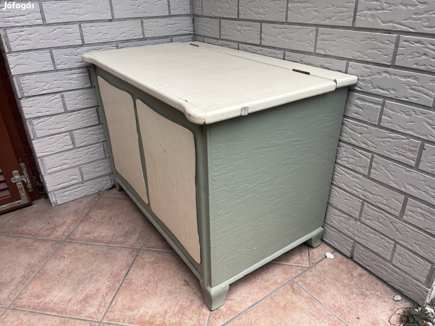 Mérete: 104 × 52 × 50 cm. A ládát nemrég festettem fel - zsályazöld kerettel és krémszínű panelekkel. Belül két részre osztott, tágas tároló tér. Felnyitható teteje zsanérokkal rögzített. Kiváló állapot, azonnal használható. Kerti tárolónak, előszobába vagy nappali mellé is tökéletes.