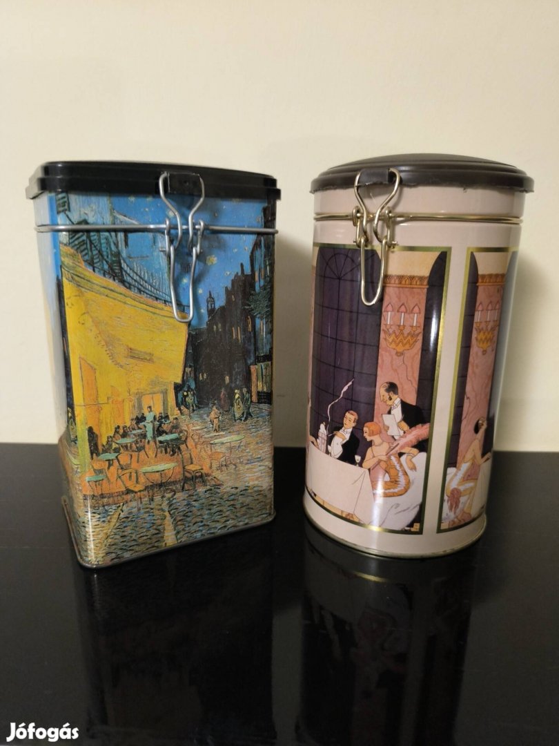 2 db csatos fedeles (a fedél műanyag), fém doboz. 19 cm magas.