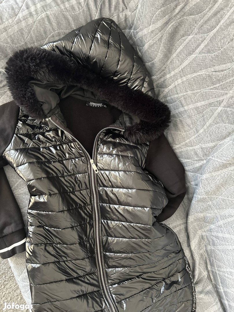 Fekete fényes hosszú női kabát prémes kapucnival M-es méretben eladó.