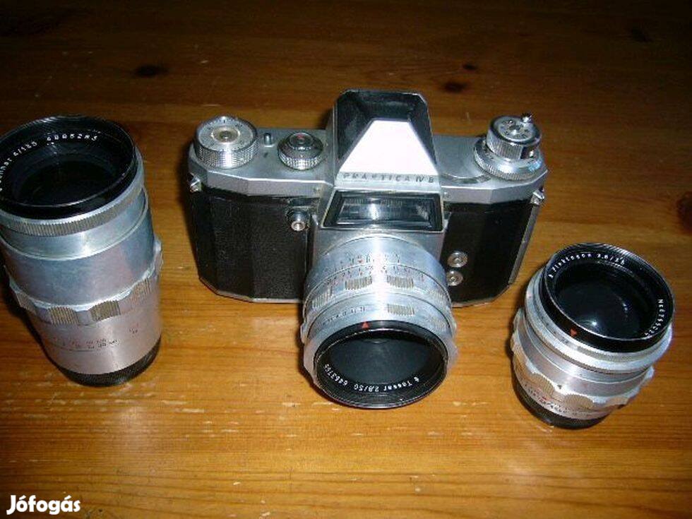 Praktica IV B, fénymérős, alsó felhúzókaros, Tessar 2,8/50 alap és Flektogon 2,8/35 , Sonnar 4/135 -ös régi optikákkal.