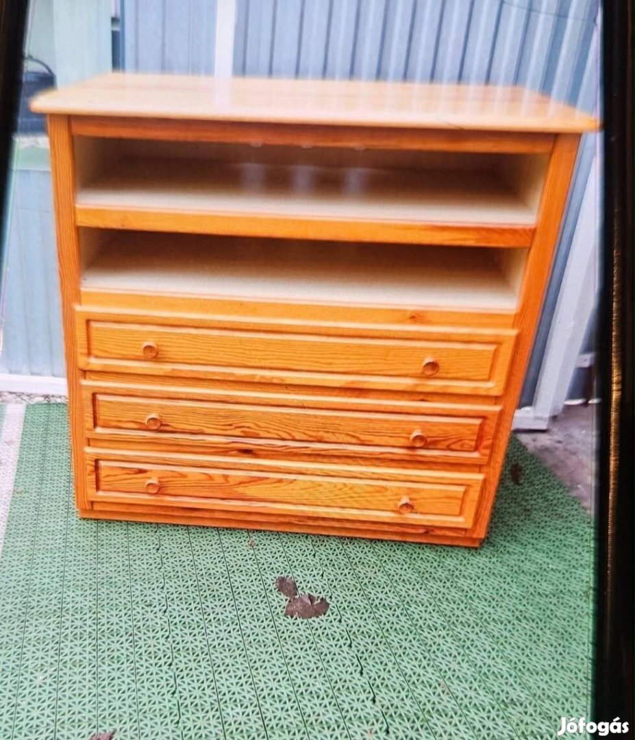 Használt, de jó állapotú fenyő komód eladó. Fent 3 polcos rész TV-hez vagy dekorációhoz ideális, alul 3 tágas fiók ruhákhoz, ágyneműhöz. Masszív fa szerkezet, natúr felület, karcmentes fiókok. Méret: 95x53x90 cm. Budapesten személyes átvétel.