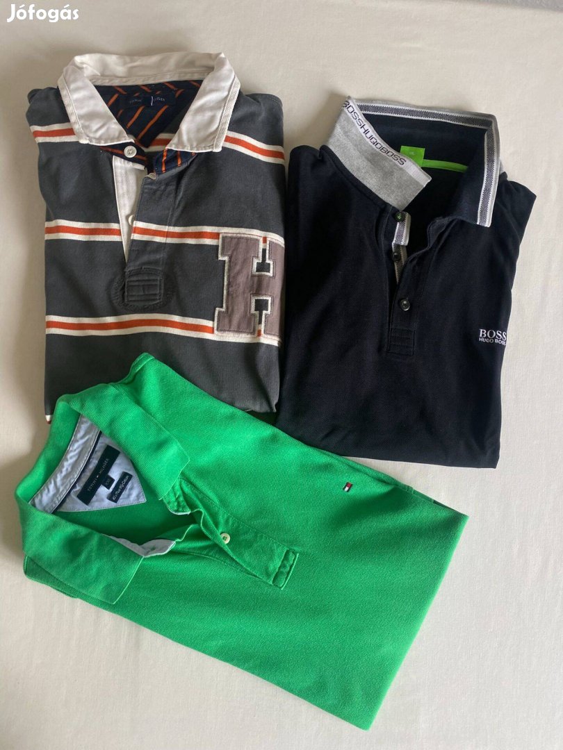 Eladó férfi galléros póló csomag, 2db Tommy Hilfiger (a csíkos hosszú ujjú), 1 db Hugo Boss, pólók, hibásak, a két Tommy-n javítás található, a Hugo Boss szimplán csak használt de még viselhetők, XXL-es méretben.