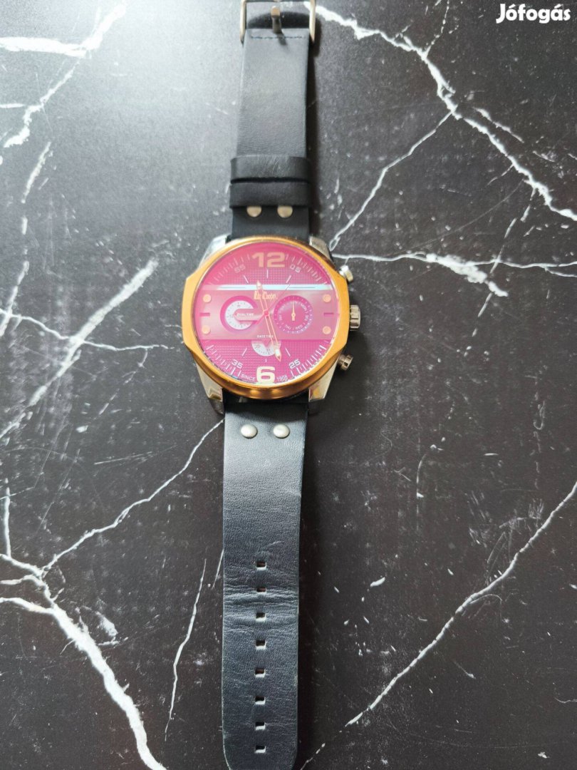 Lee Cooper egyszer viselt karóra eladó! Különleges üveggel, ami ha úgy esik a fény mályvás, ha nem kékes színű lesz! Vastag 15 milis tokkal igazán férfias darab!! 2 napja kapott óra szalonban új elemet, így jó ideig az is letudva!