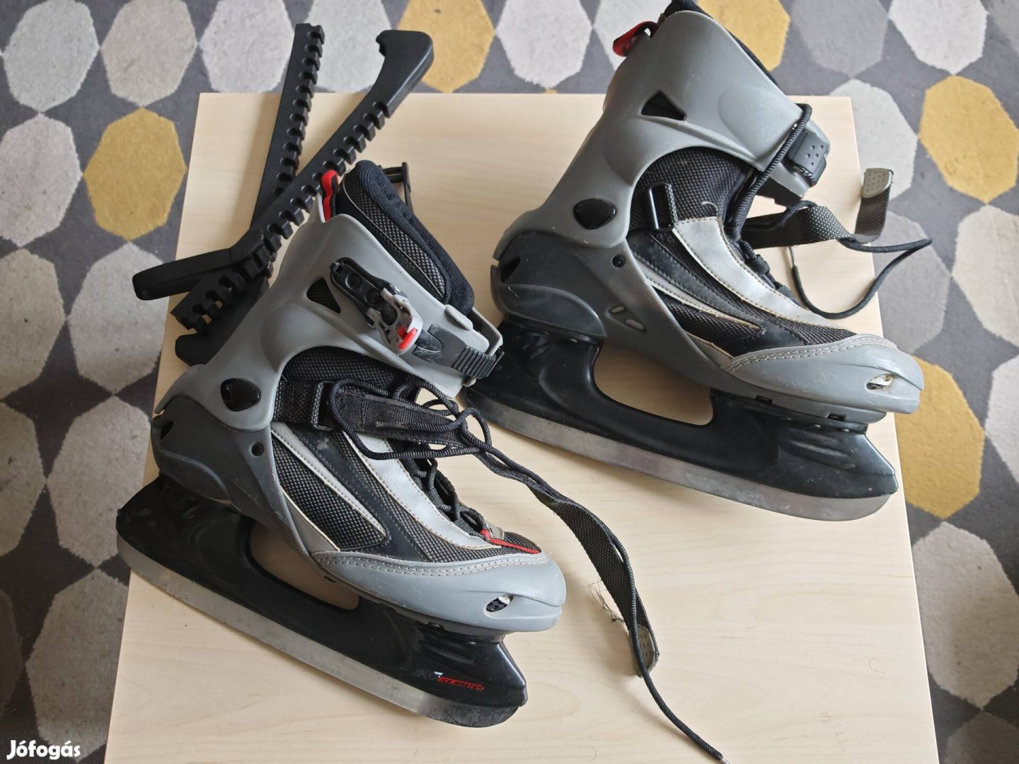 Használt jégkorcsolya, 42-es méret. Élein némi korrózió, ebben a minőségi kategóriában szerintem elfogadható, élezés után valószínűleg nincs vele gond. Horribilis ára hűen tükrözi minőségét és állapotát. Csak személyesen, nincs kedved csomaggal bajlódni. Az ár alkuképes, ha valakinek ez a heppje. Élvédő van hozzá.