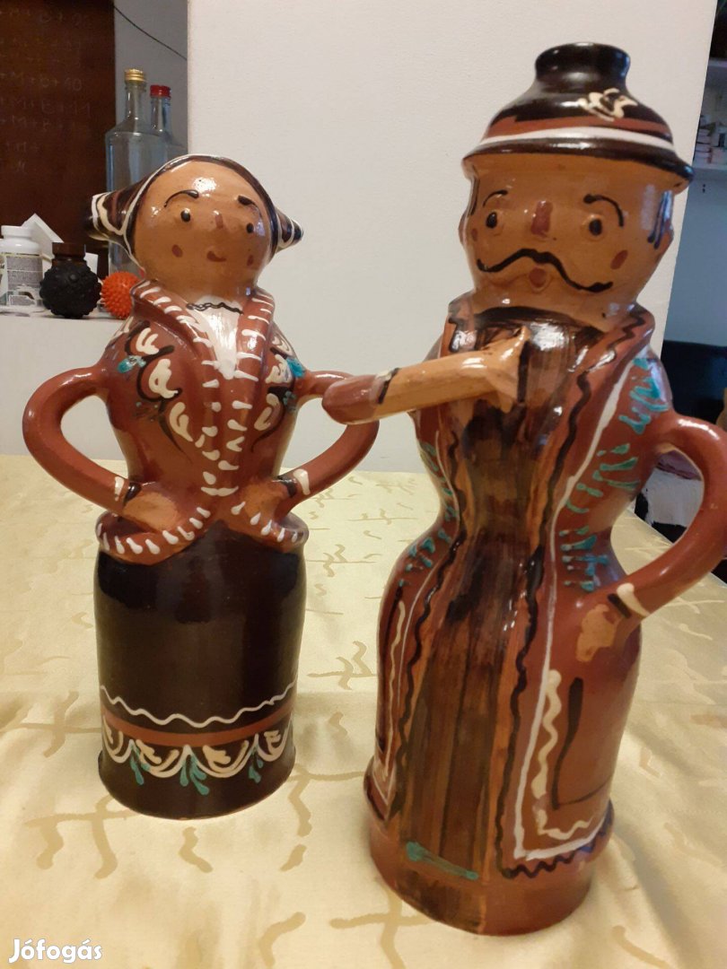 Eladó férfi-nő népviseletben, páros szobor (festett, mázas cserép), 30 ill 33 cm magasak. Csak együtt vihetők, a férfi fejtetője lyukas (gyertyának). Ára: 5.000 Ft. Bp. Zugló, nem postázom.