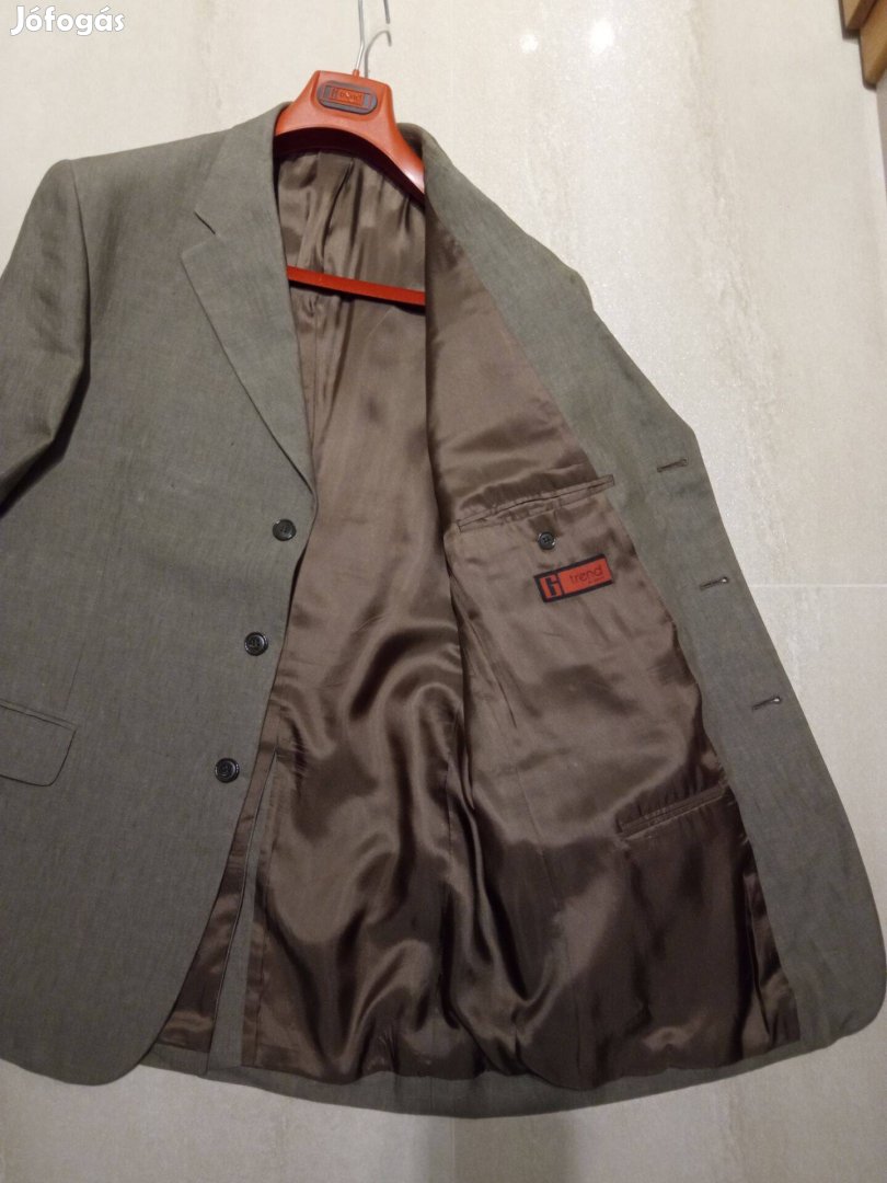 Eladó a képeken látható klasszikus stílusú öltöny. Kb 5-6 éve vásároltam a griff áruházban, de csak egy, fél órás alkalommal viseltem, gyakorlatilag új. Középbarna a színe, anyaga lenvászon. Vettem hozzá egy második nadrágot is ami vilgos bézs, ekrű színű (egyszer sem hordott).