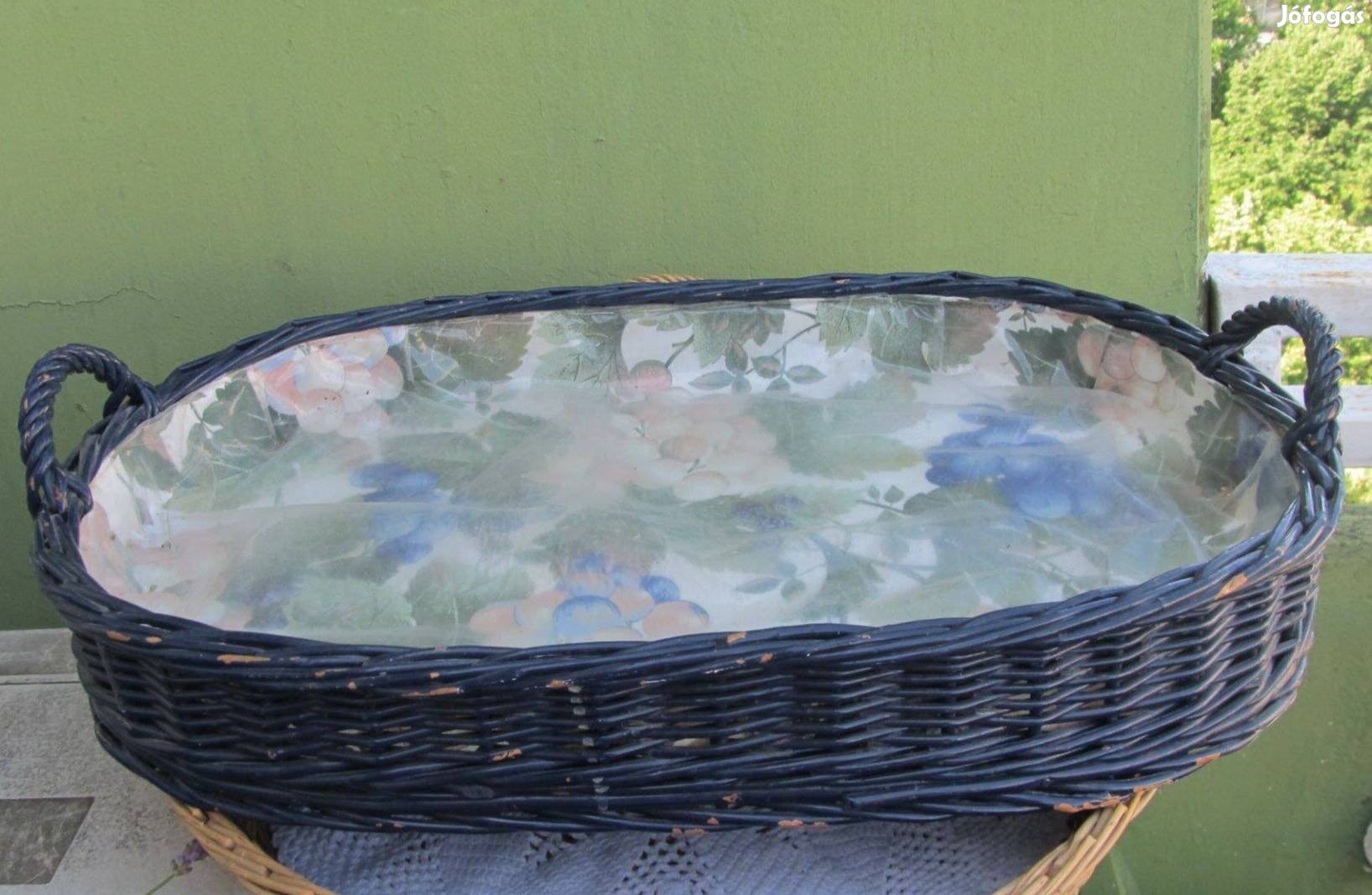 Eladásra kínálom a képen szereplő festett, fa betétes, vesszőfonott, füles tálcát. Szép, különleges. Stabil jó állapotban. Nylonnal és szőlő mintás papírral bélelt.