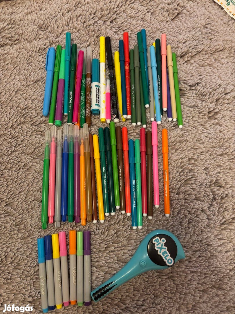 Kb 40 db filctoll, illetve egy Pixelo toll (Az elektronikus toll használata egyszerű: a kis alkotóknak csak bele kell helyezniük a színes filctollak valamelyikét a pontozóeszközbe, ami - a bekapcsolást követően - mozgatni kezdi a tollat, ezzel a gyerekek pontozó, vagy a tollat kicsit megdöntve akár csíkozó mintát is készíthetnek).
