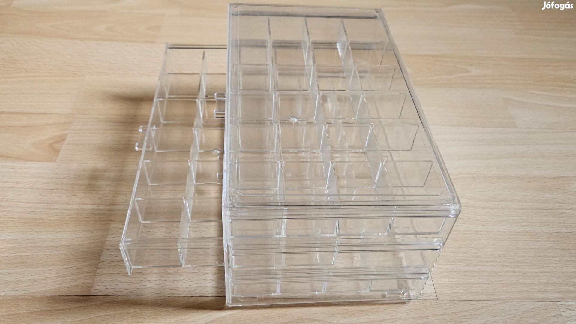 Eladó a képen látható 3 fiókos átlátszó akrill tároló doboz. Használható pl ékszerek (pl fülbevalók, gyűrűk, nyakláncok), érmék, egyéb kisebb tárgyak tárolására. Teljesen új, hibátlan, fix áras termék.