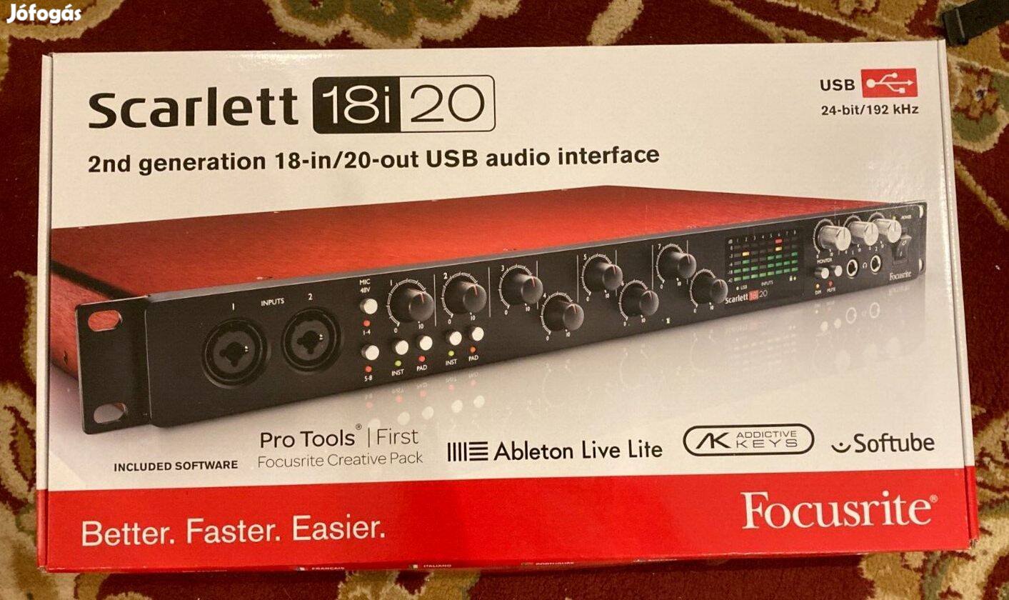 A Focusrite Scarlett 18i20 ideális rackbeépíthető studio készülék. Ha egy komplett dobfelszerelés felvétele a cél, vagy más különböző eszköz, vokalisták, elektromos billentyűshangszerek egyidejű rögzítése, erre összesen 18 bemenet és 20 kimenet áll rendelkezésedre közvetlenül. Ezek között nyolc, új fejlesztésú, természetes hangzású mikrofon előfok található kombinált bementi csatlakozókkal szerelve, szuper alacsony latency-t* és osztályában kimagasló hangminőséget nyújtó digitalizálás teszi fejlettebbé a a további be és kimeneteket. Az Adat csatlakozás felhasználásával további analóg bejáratokat rögzíthetsz. . A Pro Tools mellett is elsőosztályú megoldás a Focusrite. Hogy tökéletesebb legyen az összhang, a Focusrite és az Avid együtt dolgoztak és a legújabb Pro Tools verzió fejlesztésekor tesztelték a teljes Scarlett családot. A Scarlett 18i20 kompatibilis az összes jelentős DAW-l, mind Mac és PC irányban is.