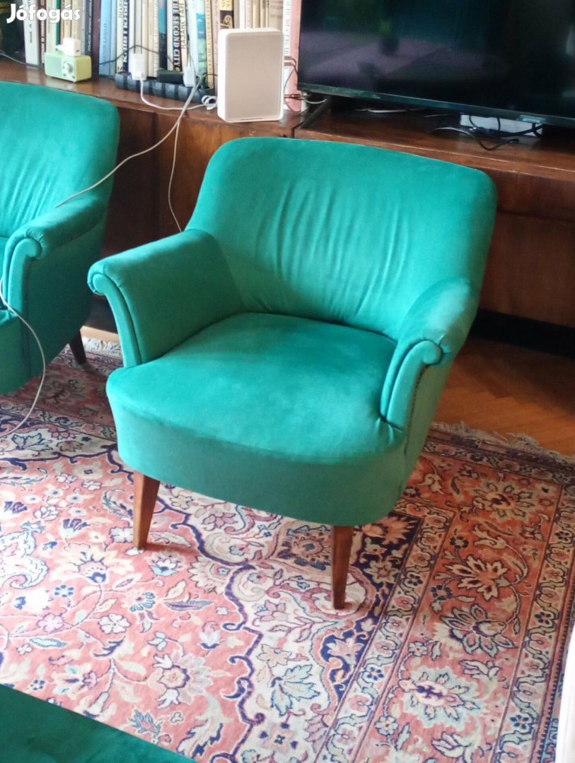 Eladó két hibátlan, 2025-ben felújított, 20-as évekből származó, zöld színű fotel. Egyenként 40eFt/darab, vagy a kettő együtt 70eFt. Érdeklődni telefonon vagy üzenetben, átvenni személyesen lehet, helyben.