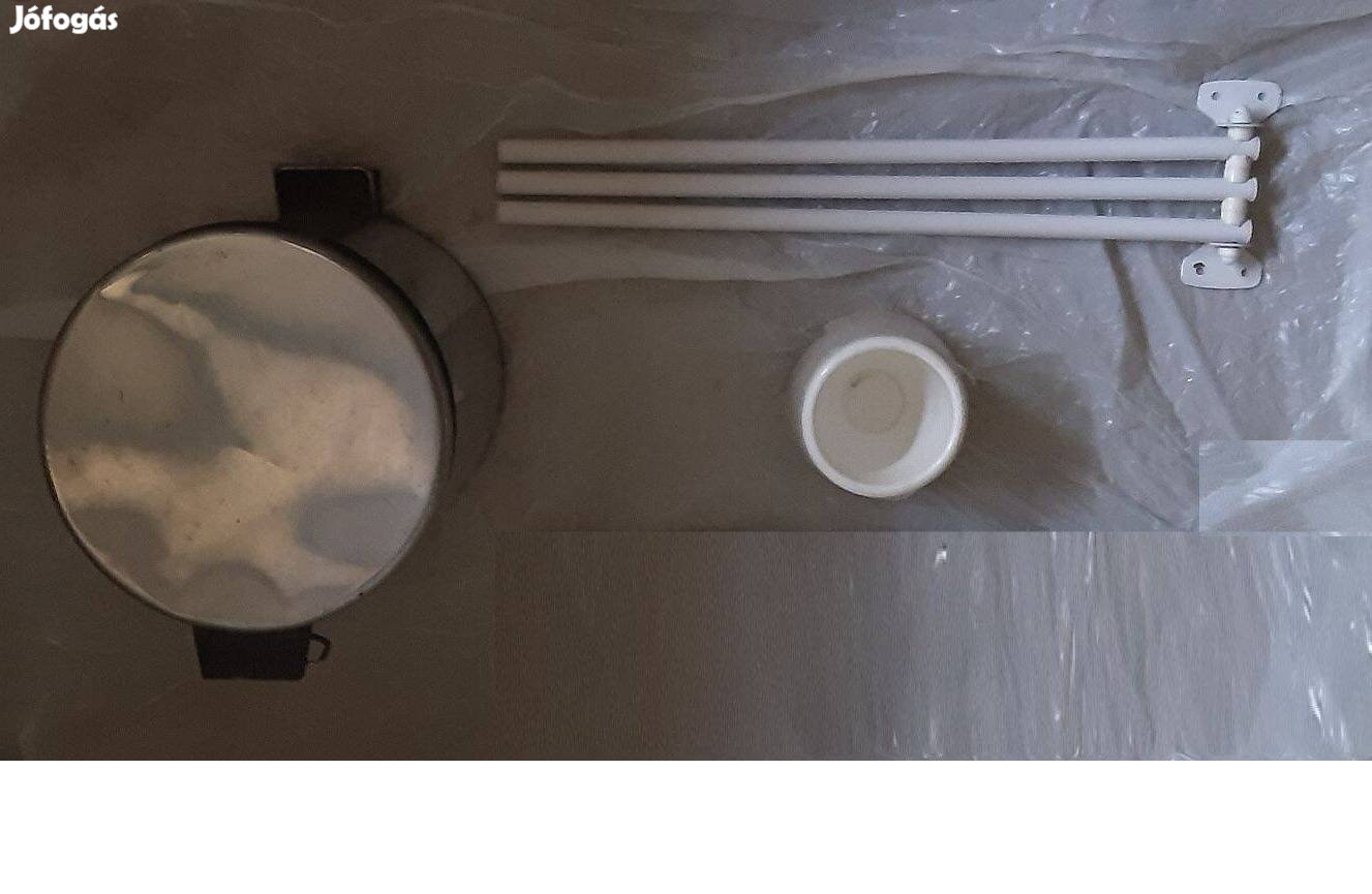 eladó a képen látható raktárkészletről fürdőszoba felszerelés kiegészítő szett: 1db 3 karos törölközőtartó , kis szemetes , wc kefe tartó, . A 3db együtt egyben eladó összesen 3000 Ft-ért. Külön is eladók MÁS áron.