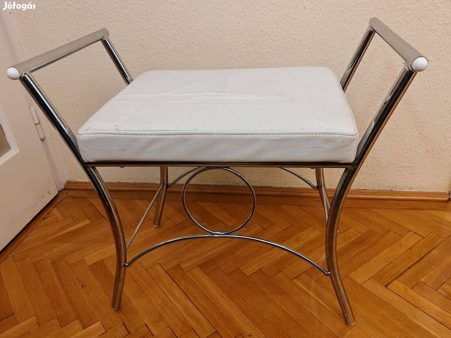 Fürdőszobai ülőke / kis szék eladó. Kikában vásárolt, váza hibátlan, a műbőr szövet elhasználódott, ahogy a képen is látható.