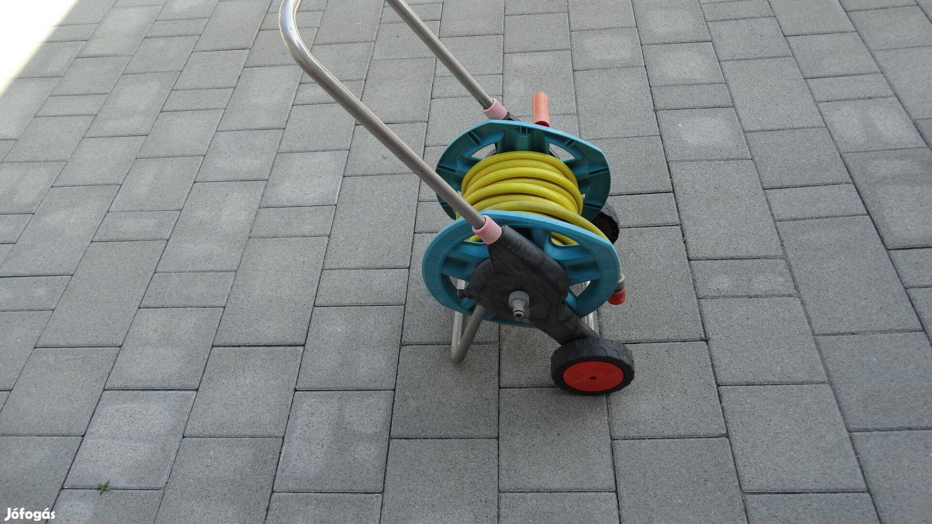 Eladó gardena tömlőkocsi kb. 9m locsolótömlővel.