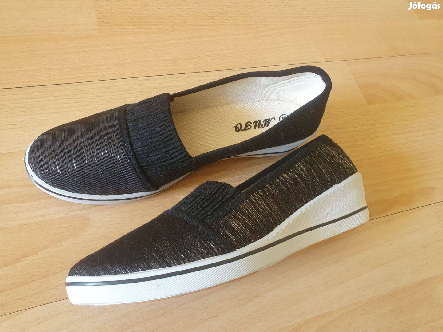Enyhén csillogó fekete anyag, kényelmes gumitalp, beírt méret 38, de 37-es lábra való. Új állapotban.