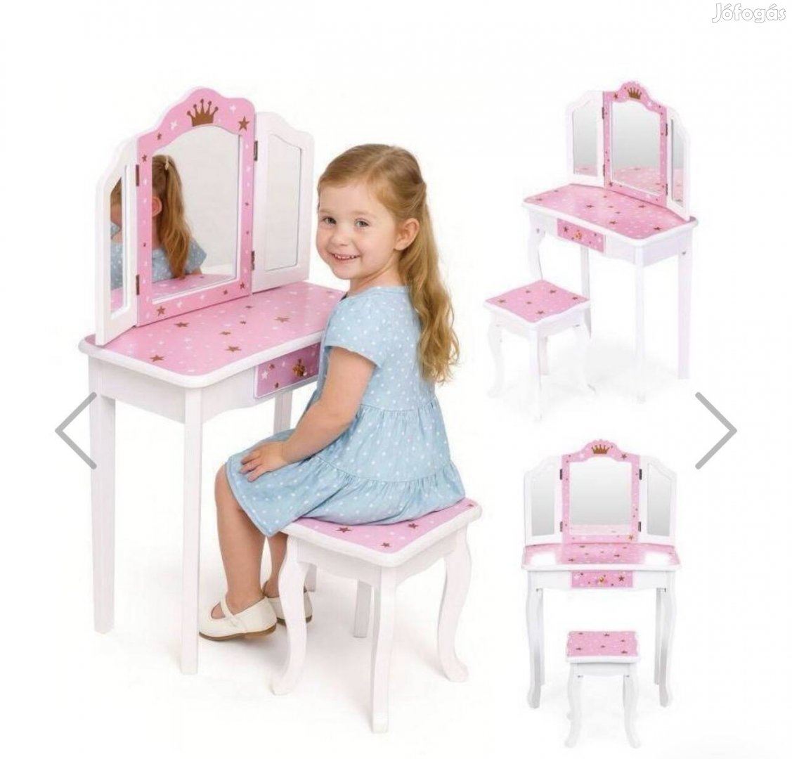 Fából készült , rózsaszín / fehér gyerek fésülködőasztal, led tükörrel és székkel,
