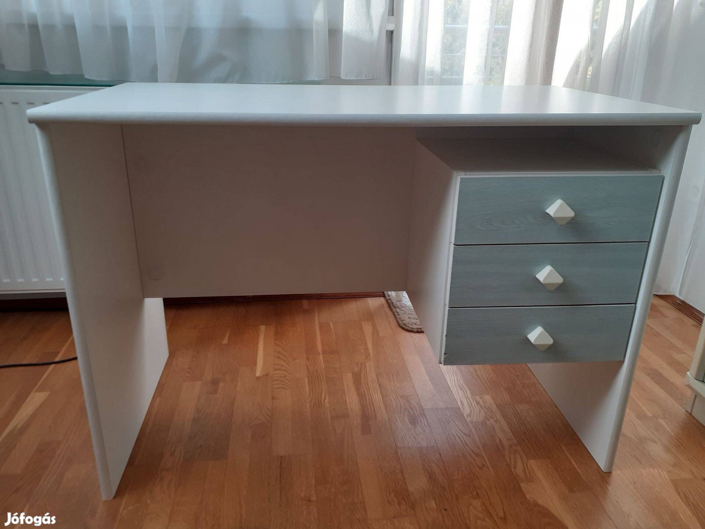 Fehér bútorlap, a fiókok frontlapja halványzöld.