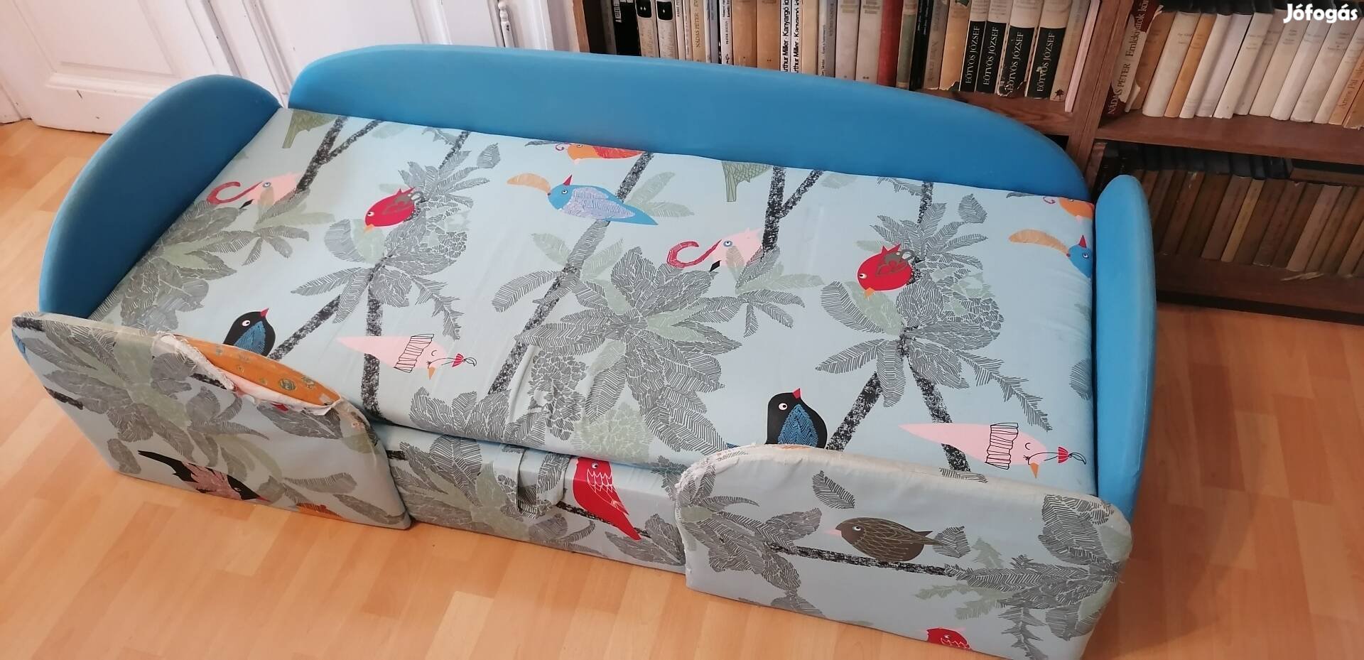 Eladásra kínálom a képeken látható gyermekágyat. Az eredeti narancsszínű borításra mi régen rátettük ezt a madár mintás, kék színű borítást, és így használtuk. Ennek legnagyobb kopottságú részei láthatóak a képeken. Aki lát benne fantáziát, az akár házilag újrahúzhatja a borítást. A fekvő felülete 65x154 cm. Ágyneműtartós, aminek szerkezete hibátlan.