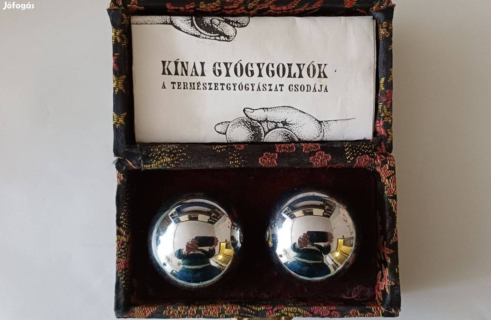 Két db. markoló golyó. Mozgatás közben kellemes hangot is kiad.Kínában nap mint nap látni, de már Európában sem ritkaság .A golyóterápia a 14. században uralomra került Ming-dinasztia idejéből származik. Újszerű, doboza kissé sérült.