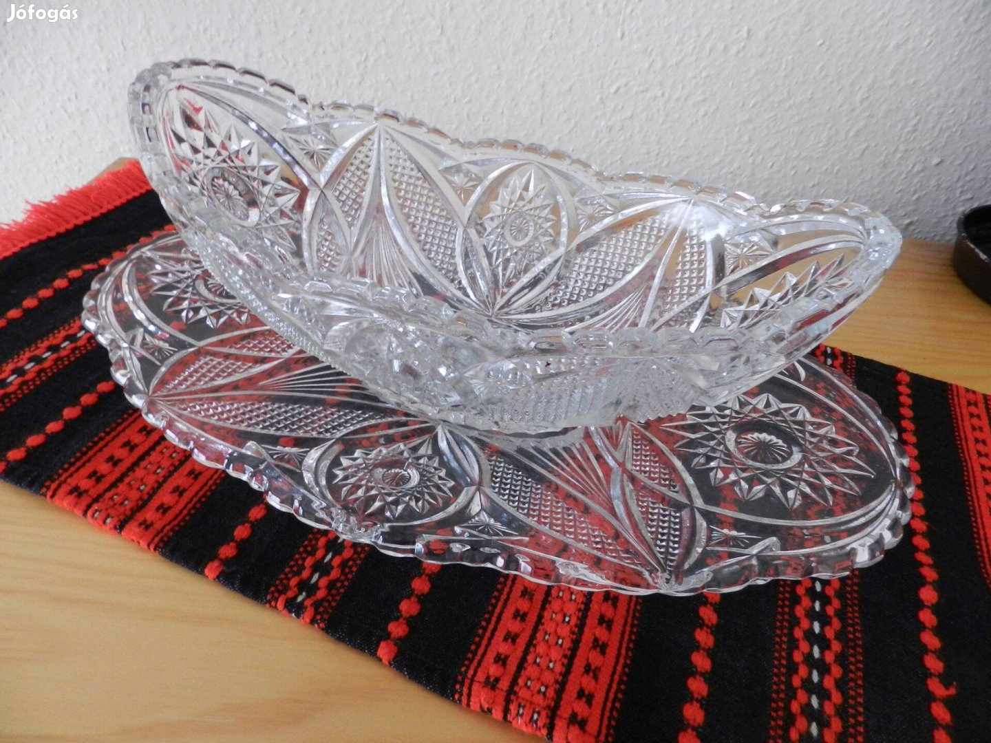 Kristály jellegű, kínáló készlet. A tányér 41x25, a tál 31x17 cm. Magassága 12 cm.