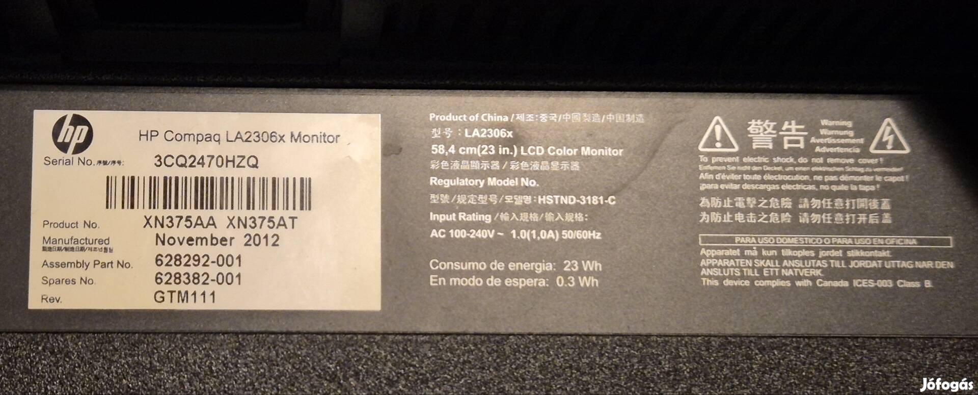 HP Compaq LA2306x monitor. Nagyon jó állapotban. Full HD. DVI-D. VGA. Display Port. November 2012.