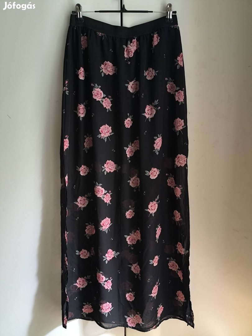 38-as, H&M szoknya, alsó réteg fekete mini, rajta hosszú, rózsamintás áttetsző anyag.