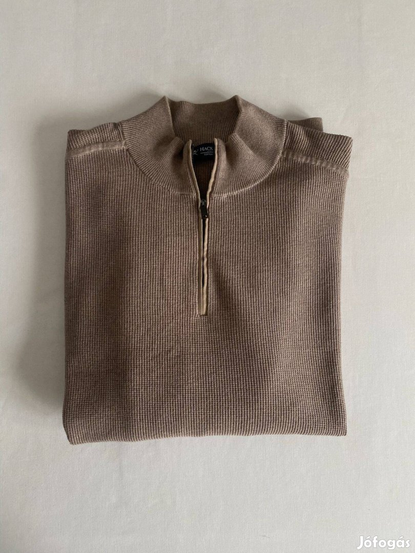 Eladó Hackett férfi kötött 1/4 cipzáros pulóver, szürkés drapp, kevert szálas pamut-selyem, kiváló állapotú, XXL-es méretben.
