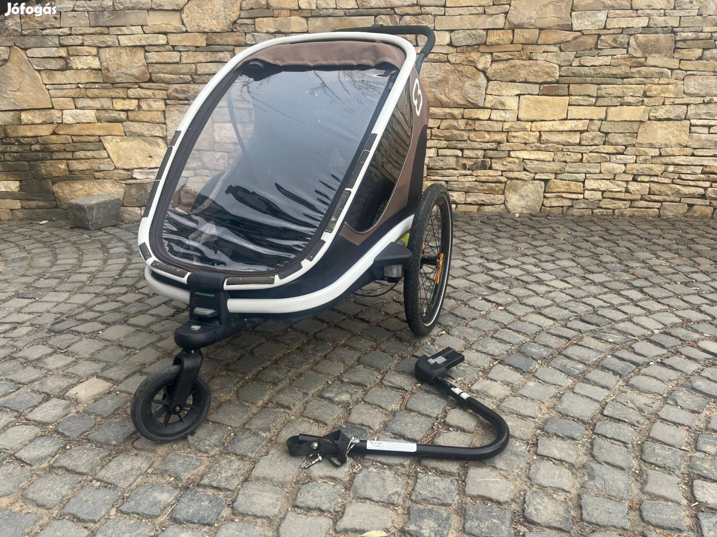 Hamax Outback twin kerékpáros utánfutó. Két gyerek számára biztonságos, dönthető öt pontos ülésekkel, szúnyoghálóval, esővédővel. Futó babakocsiként, és kerékpár utánfutóként is használható, megvan minden alkatrésze, a zászló is, ami lemaradt a fényképről.
