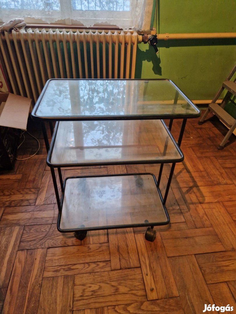 Háromszintes üveglapos gurulós asztal. Stabil fémváz, ép és karcmentes, jól guruló kerekek. Használt hibátlan állapot, enyhén poros. Dohányzóasztalnak, kiszolgálókocsinak vagy tárolónak is ideális.