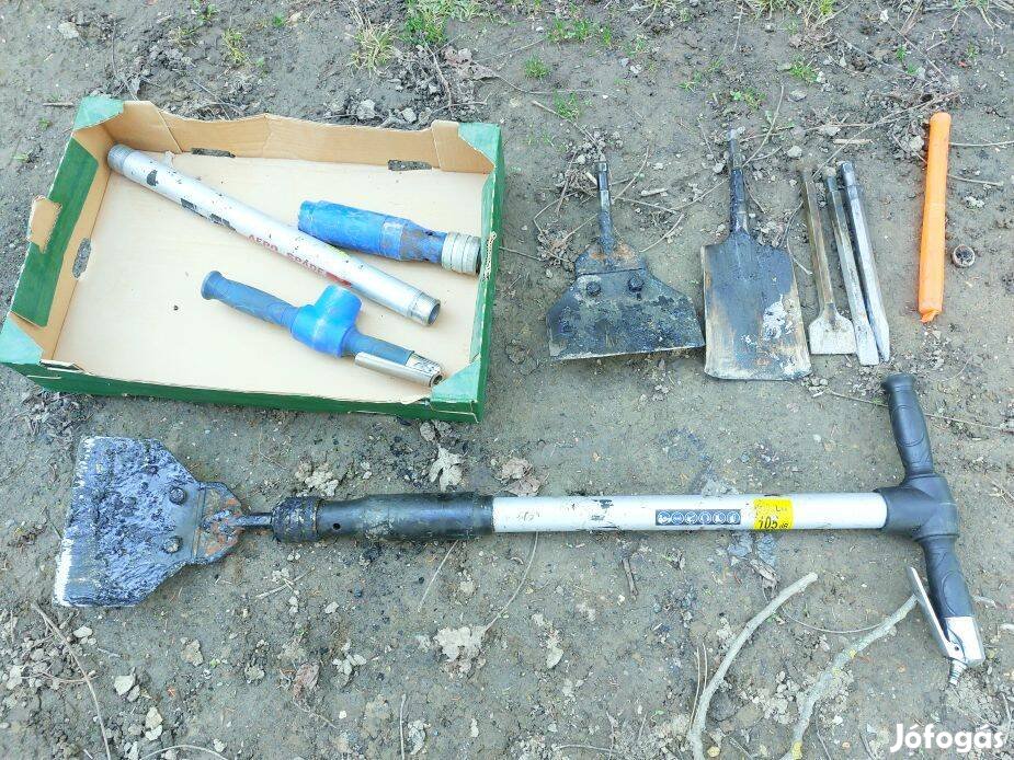 Használt, a képeken látható állapotú Scheppach Aero2Spade légkalapács tartozékaival (2 kaparó, ásó, laposvéső, hegyesvéső, szélesvéső) és pótalkatrészekkel (egy géptest, egy fogantyú és egy ütőmű)