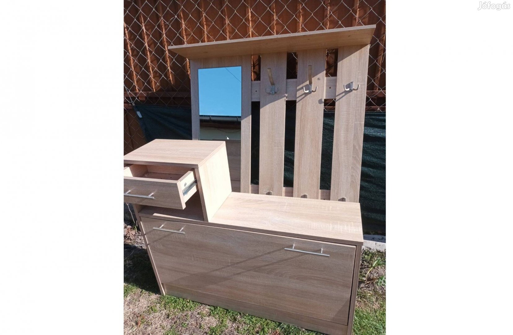 Költözés miatt eladó használt, de jó állapotban lévő előszobai cipőtartó és tükrös felső rész