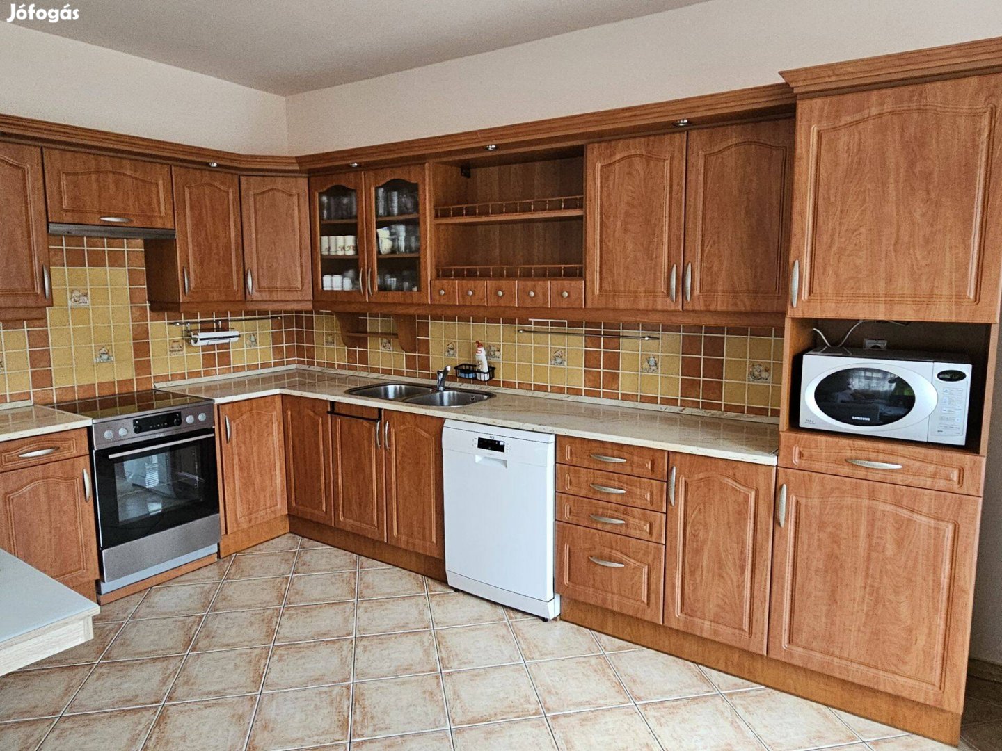 Eladó használt sarok konyhabútor, calvados bútorlapból, beépített spotlámpákkal, rozsdamentes Teka mosogatóval. Mérete: 202 x 390x cm, 221 cm magas. A bútor korának megfelelő állapotban van. Az ár a konyhai gépek árát nem tartalmazza.