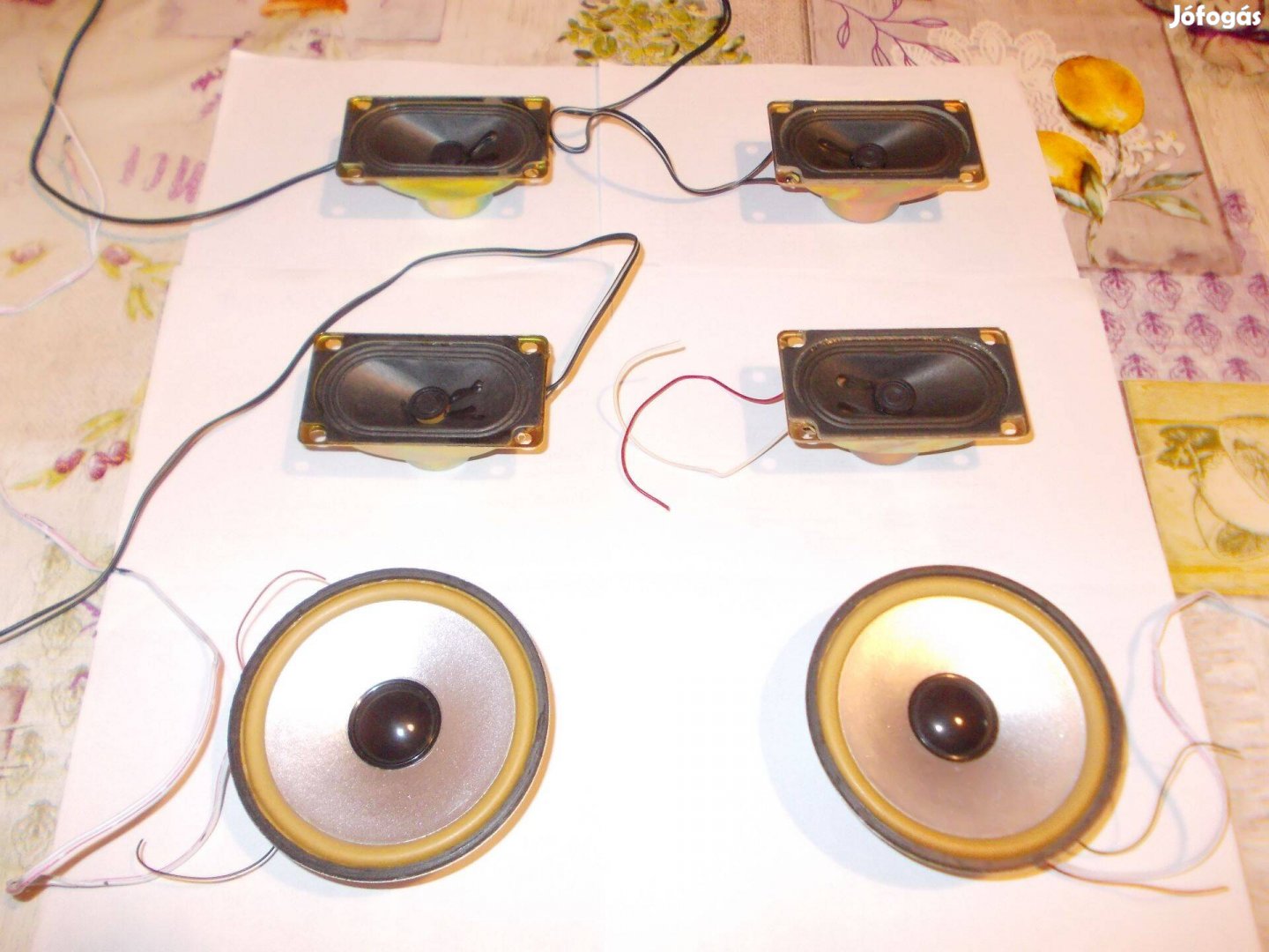 Hat hangszóró fém hangfal rács előlap és nedvszívó zacskó együtt eladó. A kerek hangszórók=8 ohm 4 watt, teljes átmérő 10 cm/magasság 3 cm// A téglalap alakúak 4 ohm 3 watt/hossza 9 cm/szélesség 5 cm/magasság 3,5 cm. A fém hangfal rács=41,5*24,5 cm méretű. A nedvszívó zacskó kb fél kilós lehet. Minden tökéletes állapotú. Az ár az összesre vonatkozik együtt.