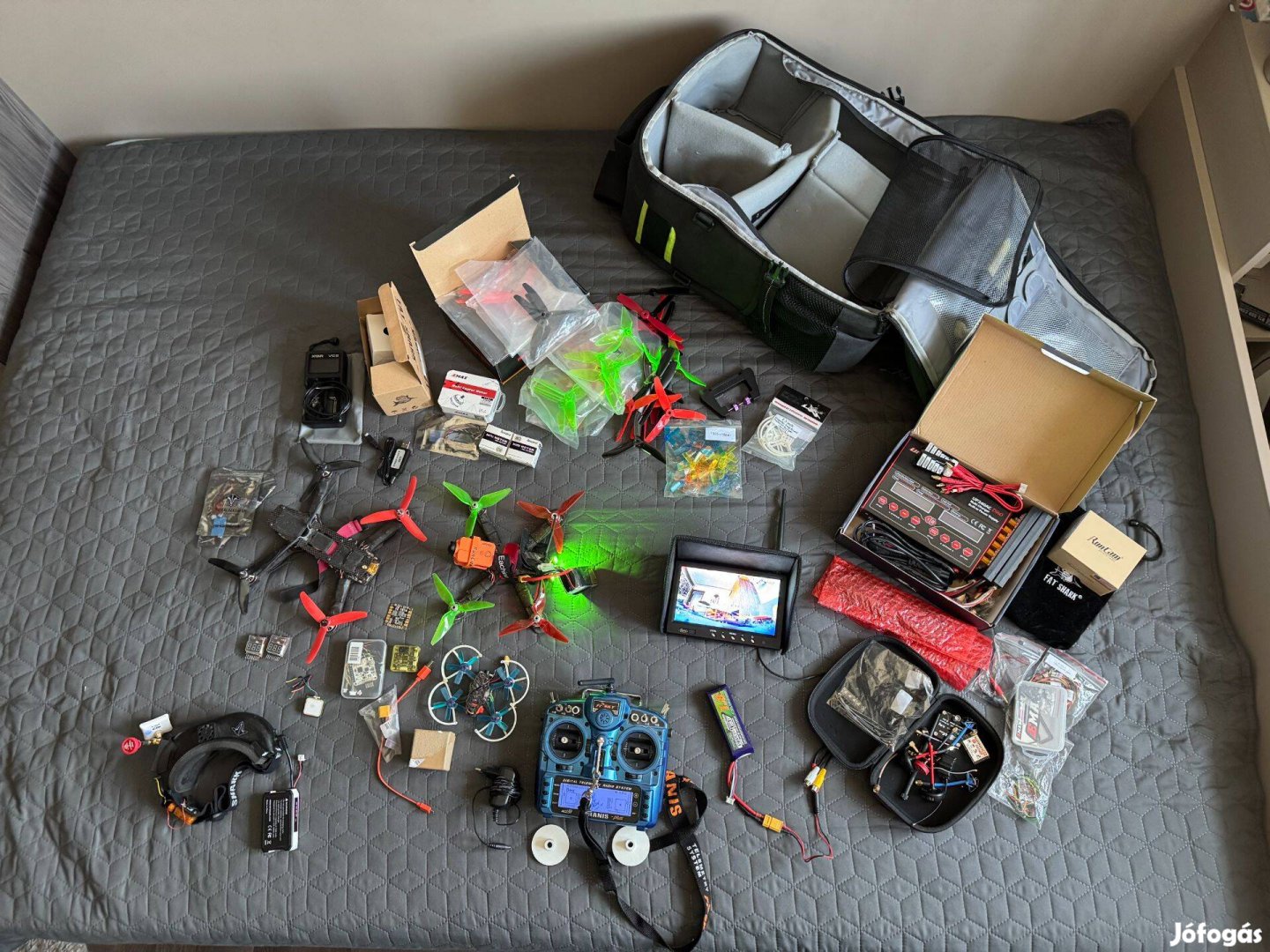 Hatalmas FPV drón csomag: Taranis X9D, Fatshark, 3 drón, töltők, táska