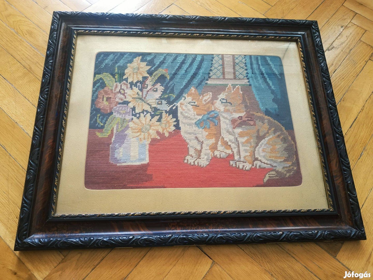 Hatalmas, keretezett macskás csendélet gobelin/goblein (69x56cm)