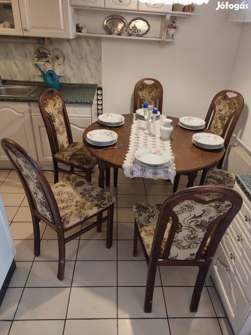 Kör alakú, 110 cm átmérőjű étkezőasztal, bővítő elemmel 150 cm hosszúra növelhető. Sötét dió színű, tömör fa asztal. Hozzá tartozik 6 darab fa étkezőszék, kárpitozott ülőrésszel és háttámlával. Jó állapotú garnitúra.