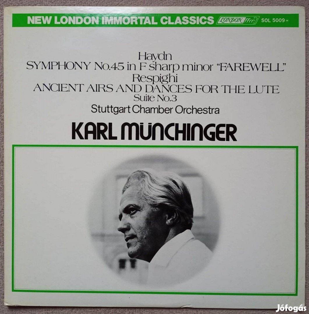 Eladó Haydn és Respighi művek Karl Münchinger vezényletével, "London" (Decca) kiadású, japán fehér címkés (promó) LP-n. A lemez és a borító is kifogástalan (NM) állapotú.