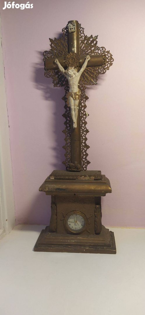 Fa feszület ón díszekkel felújított, ám vélhetőleg korának nem megfelelő óraszerkezettel. Az óra működik.