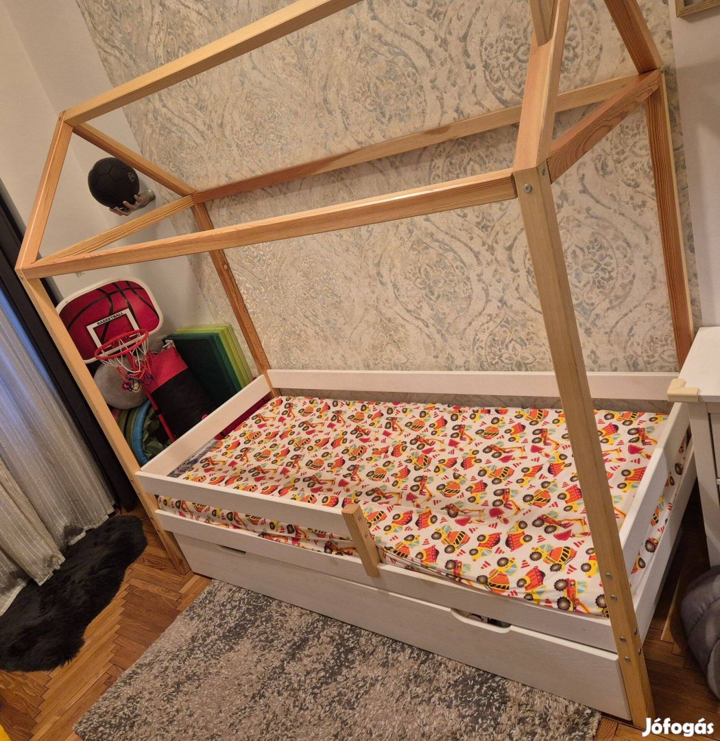 Eladó hibátlan állapotú, használt, házikó formájú gyerekágy. A házikó ágy tartozéka a biztonsági korlát, a fa ágyrács és az kerekes ágyneműtartó fiók. Az ágy feletti házikó szerkezete légies, és különféle világítótestekkel díszíthető, vagy a gyerekek által kedvelt bunkerré alakítható.