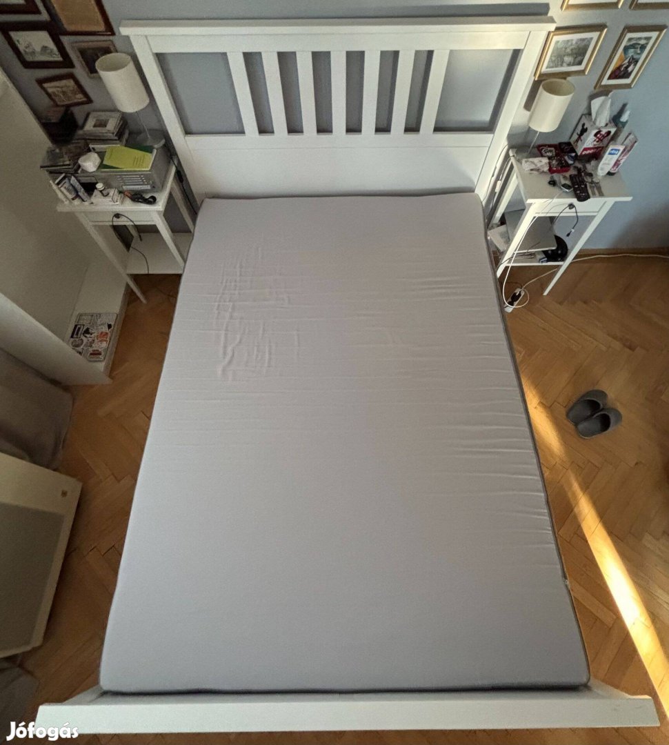 Fehér Hemnes ágykeret 140x200 cm, hozzá tartozó matraccal. A lábtámla egyik sarkán van egy kicsi kopás, fényképen látható. Lapra szerelve (egyben sajnos nem lehet kivinni a lakásból), egyeztetett időpontban, személyesen elvihető Budapest II. kerületből.