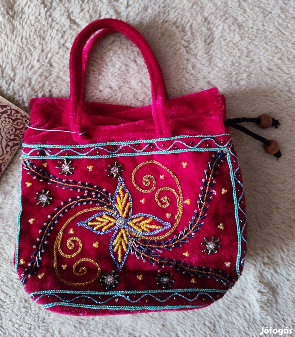 Új, alkalmi, bordó bársony alapra készült, gazdag kézi gyöngyhímzéssel, fémszálas díszítéssel, virágos és indás motívumokkal készült kézitáska.